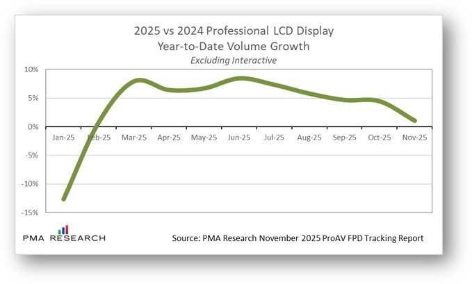 San Juan Capistrano, California – December 22, 2025. PMA Research (PMA), the worldwide market information experts on large displays, have published their latest sell-through tracking reports on large-format (32-inch and larger) flat panel displays being sold by leading North American Pro AV Dealers and Systems Integrators who typically serve commercial markets.